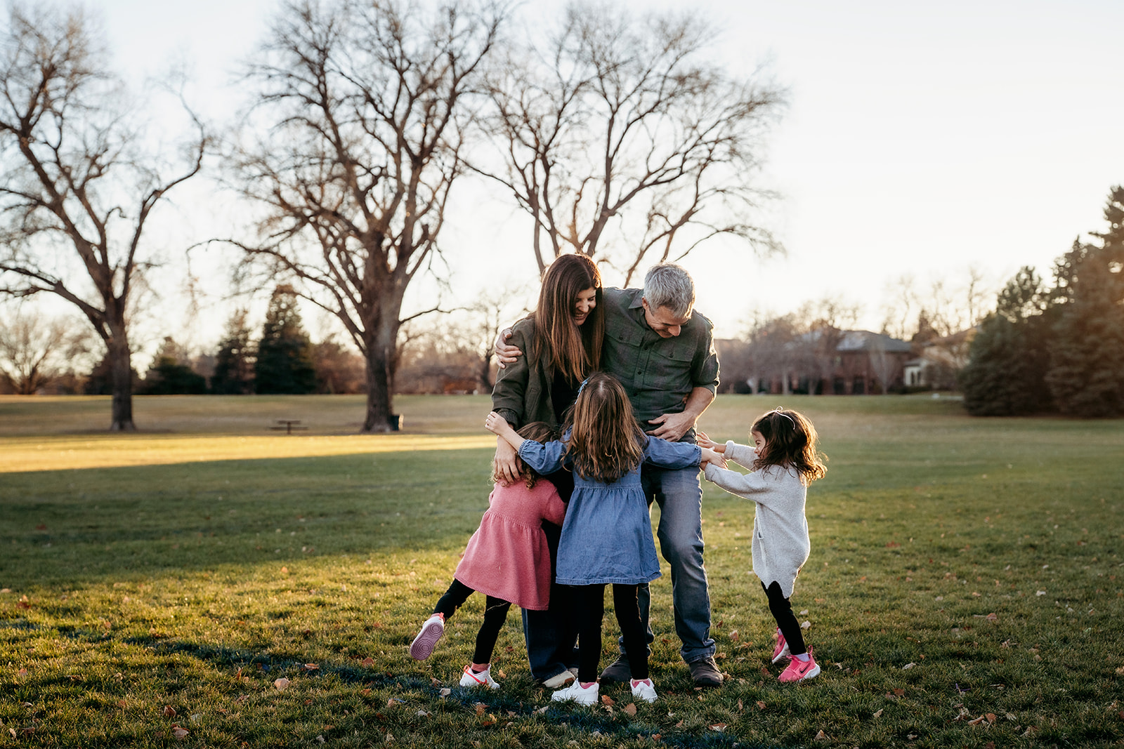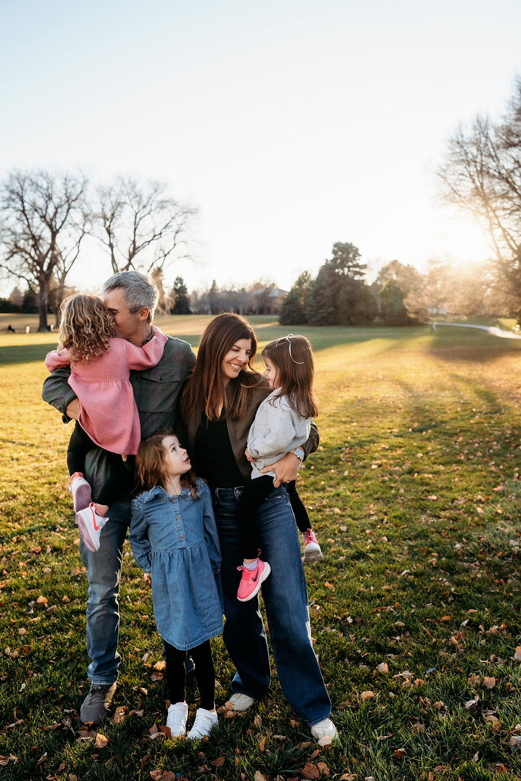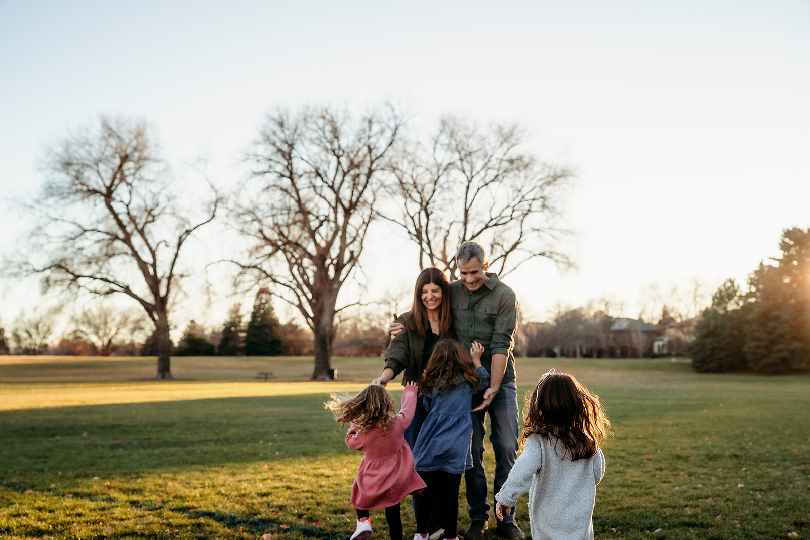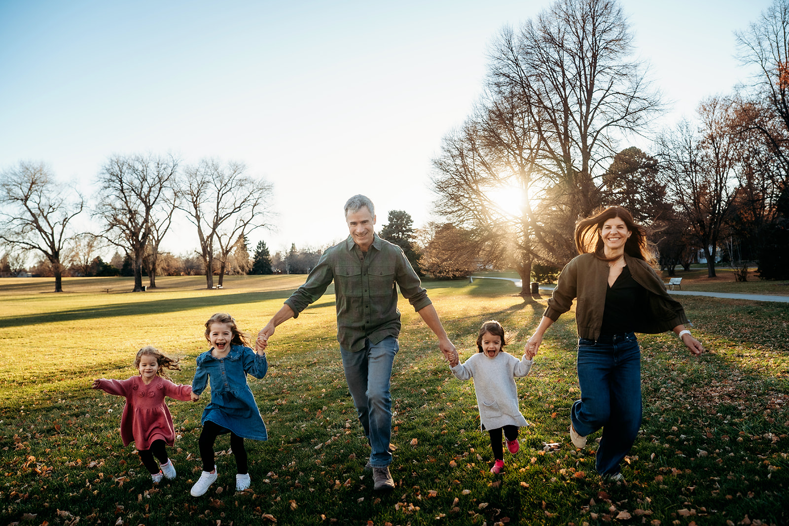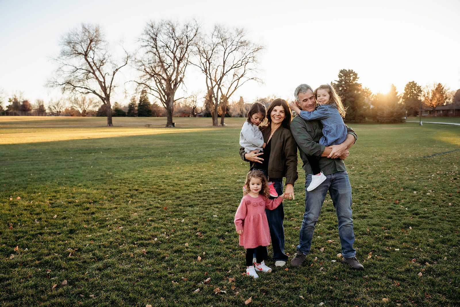 In all my years as a Denver family photographer, I can confidently say that great light, connection, and movement matter far more than perfectly styled landscaping. A small patio, a patch of grass, a hammock, or even a favorite play area can create beautiful and meaningful backyard family photos. Sometimes we’ll also incorporate nearby spaces like a neighborhood park (like we did with the Cooper family) for a little extra room to play.